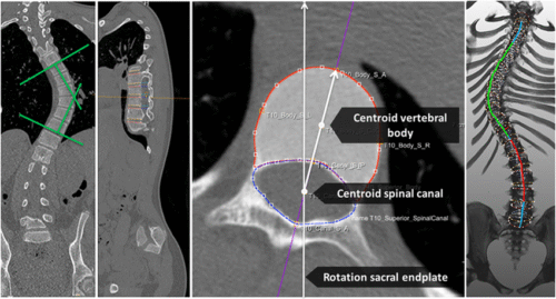 يقوم الأطباء عادةً بقياس زاوية الانحناء التقليدية لتحديد شدة اعوجاج العمود الفقري، ولكن الأشعة المقطعية تسمح أيضًا بقياس: