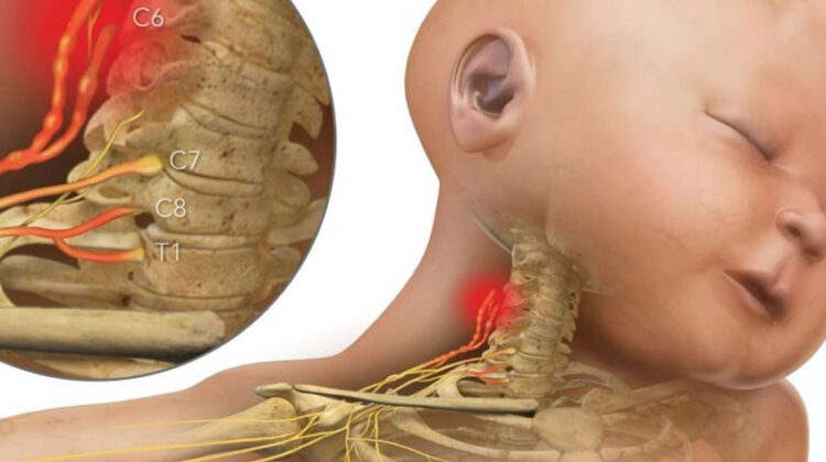 وتسمى هذه الإصابة شلل الضفيرة العضدية الولادي.