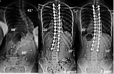 تُعرف باسم “دمج الفقرات” أو Spinal Fusion، حيث يتم تثبيت فقرات العمود الفقري باستخدام قضبان ومسامير لمنع الانحناء من التزايد. رغم فعاليتها في السيطرة على الانحناء، إلا أنها لا تعيد العمود الفقري إلى استقامته الكاملة دائمًا. التعافي من الجراحة قد يستغرق أشهرًا، ويُفقد المريض جزءًا من مرونة الظهر، ما قد يقيّد الأنشطة اليومية لاحقًا.