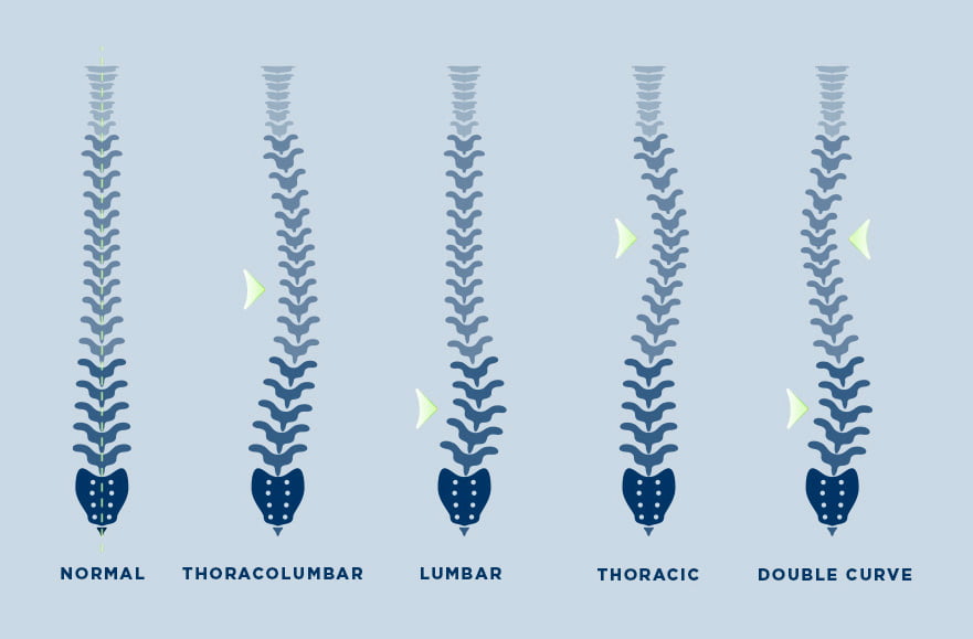 كل منحنى جنف فريد من نوعه. قد ينحني العمود الفقري إلى اليسار أو اليمين ويمكن أن يحدث في أجزاء مختلفة من العمود الفقري. إذا كان في منطقة الصدر يسمى الجنف "الصدري"، بينما إذا كان في الجزء السفلي من العمود الفقري يسمى الجنف "القطني". ومن الممكن أيضًا أن يكون هناك منحنيان؛ وهذا ما يسمى انحناء مزدوج وقد يبدو العمود الفقري على شكل حرف "S" من الخلف. ومن الممكن أيضًا الحصول على المزيد من المنحنيات التعويضية في أعلى وأسفل العمود الفقري. نظرًا لأن الجنف هو حالة ثلاثية الأبعاد ويحاول العمود الفقري دائمًا التعويض، فهناك العديد من الاختلافات المحتملة في المنحنيات. ومع ذلك، فإن المنحنى الأكثر شيوعًا هو المنحنى الصدري الأيمن.